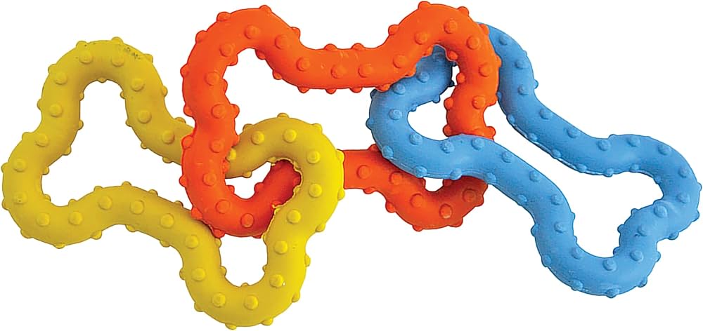 The Petstages Mini Bone Tug Puppy chew toy is a floppy and fun take on a traditional chew toy. This multicolored chew toy is made of three interlocking rubber bones that feature a ridge texture that massages your puppy's gums as they chew. The pliable rubber material makes this chew toy great for games of tug-of-war as well toss and fetch. Cleans easily with warm soap and water.